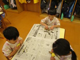 12月は、年中・年長のお遊戯会リハーサル・焼き芋・もちつきと楽しんで参加した行事がたくさんありました。