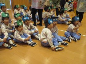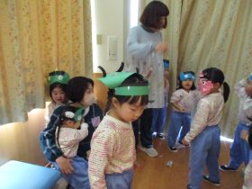 みんなで作ったお面をつけ、豆まきに参加しました。