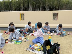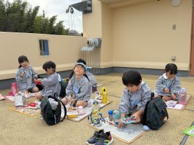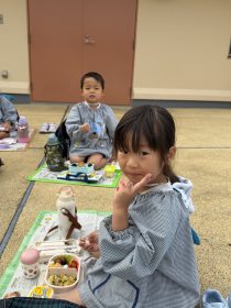 お友だちと見せ合いっこしながら好きなお友だちと楽しく食べています。