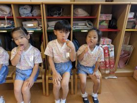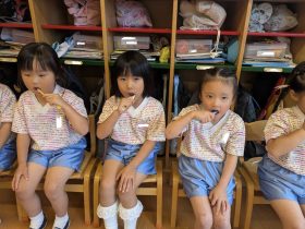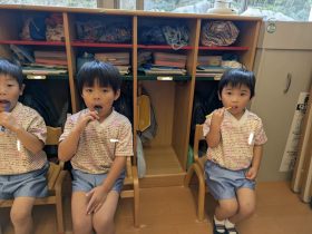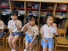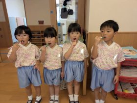 ・毎日お当番の友だちがお手本となり、歯磨き先生としてみんなの前で歯磨きをしています!(りんごぐみ🍎)