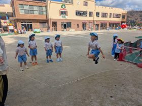 まずは長縄から始め、飛ぶ練習をし、上手に出来るようになったら縄跳びに挑戦です。