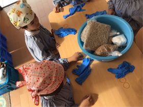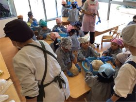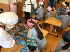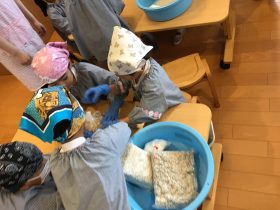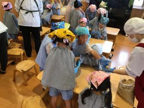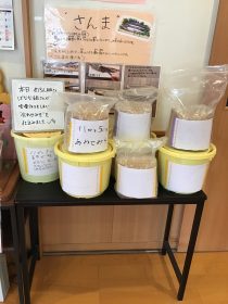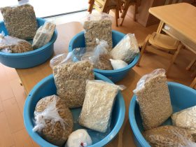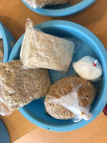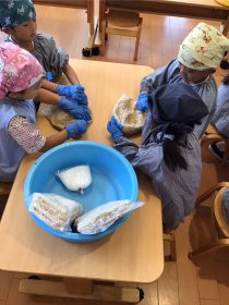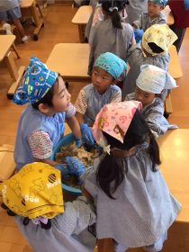 材料は蒸した大豆、米麹、麦麹、塩です。先生のお話聞いて、やり方をしっかり見てからお友達と協力しながら、みんなで材料があるか確認してから、作って行きます。