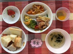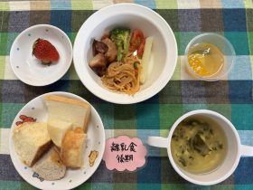 ⚫︎パンバイキング⚫︎照り焼きチキン🍗⚫︎ナポリタン⚫︎南瓜サラダ🥗⚫︎野菜🥦⚫︎中華スープ⚫︎いちご🍓⚫︎みかんゼリー🍊リス組食べれない子はダノンヨーグルトに変更